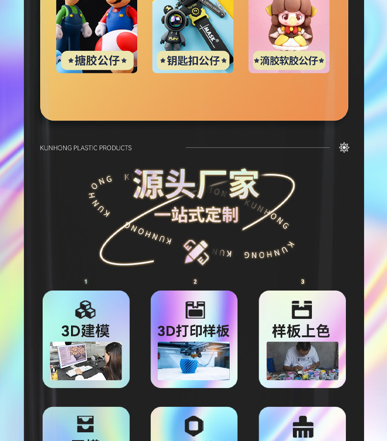 你好,歡迎訪東莞市堃鴻塑膠制品有限公司網站!主營:PVC公仔、盲盒手辦、搪膠公仔、滴膠鑰匙扣等塑膠公仔